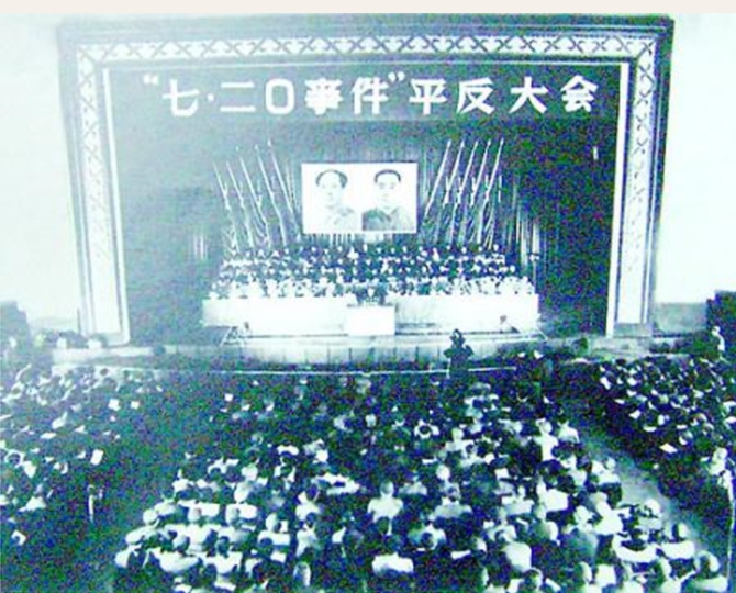 1978年11月28日,湖北举行“七二〇事件”平反大会(据湖北省委统计,全省在“七.二〇事件”后被打伤打死的人达18.4万多人,仅武汉市就有6.6万人,打死600多人。1978年11月26日中共中央批准湖北省委,省革委会,武汉军区党委《关于处理武汉“七.二〇事件”的请示报告》,11月28日宣布平反。)
